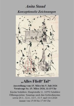 Anita Staud arbeitet bevorzugt an Orten mit Historie, an denen sie z.B. mit skriptoralen Tuschzeichnungen einen neuen Blickwinkel ermöglicht. Es sind künstlerische Recherchen, welche auch unser Kirchengebäude in Schildow – umgeben vom Fließtal – in ihre neuesten Arbeiten einbeziehen. Ihre thematische Auseinandersetzung mit Kirche und Raum sowie dem Flüsschen Tegeler Fließ zeigt die Bezugnahme auf Heraklit „Alles fließt“. Der Gedanke des Fließens, der Bewegung, der Veränderung hebt die Interpretation des Spruchs „Panta Rhei“ in eine grafische Zeichensprache. Nach christlichem Verständnis ist der stetige Wandel als Teil der göttlichen Schöpfung zu sehen. Diesen Transformationen vom Werden und Vergehen begegnet Staud kreativ und experimentell.