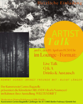 Nach dem Osterfeuer am Ostersamstag geht es weiter in Frohnau mit Entspannung, tollen Gesprächen und Kunst im Lounge-Format. Der Kunstverein im Centre Bagatelle hat ein neues Format, den „Artist Talk“ ins Leben gerufen, mit Live Talk, Q & A und natürlich Drinks und Austausch. Zum 1. Artist Talk ist „Orlando“ eingeladen, eine Künstlerin, die eine Meisterin überdimensionaler grafischer Arbeiten ist, ihre Arbeiten sind gerade in der aktuellen Ausstellung des Centre Bagatelle zu sehen. Nicht nur mit ihr, auch mit allen Besuchern, Gästen und „Kunstliebhabern“ wollen wir ins Gespräch kommen.