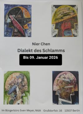In den Räumen des Bürgerbüros von Sven Meyer (Mitglied des Abgeordnetenhauses) in der Grußdorfstraße 16 in Berlin-Tegel ist bis zum 09. Januar 2026 die Ausstellung „Dialekt des Schlamm“ der Künstlerin Nier Chen zu sehen.