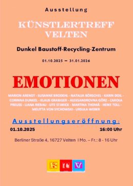 Die Werke von Künstlerinnen des Künstlertreffs Velten laden ein, unter dem Titel „Emotionen“ in der Firma Dunkel Baustoff-Recycling-Zentrum in Velten bis 31. Januar 2026, in einer besonderen Ausstellung „Kunst zu genießen“.