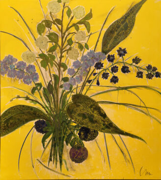 Seit 2025 taucht das Blumenmotiv erneut auf. Im Unterschied zu 2005 finden wir dunkle Farben und komplexe, teilweise wie geologische Formationen wirkende Oberflächenstrukturen. Ein energetischer, intuitiver Gestus prägt sich aus, der im Werk der Malerin generell vermehrt in den Vordergrund tritt. Aus der Balance von Geschwindigkeit / Spontaneität, mehrfachen Überarbeitungsprozessen und dem Experiment mit verschiedensten Malmitteln schafft sie brillante, nahezu organisch gewachsene Strukturen.