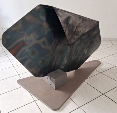 Der Fallen shadow 01 von 2026 – ein Schatten unbekannter Herkunft fällt auf die Erde, von Margret Holz in Stahl materialisiert. Ist es der Schatten nahenden Unheils? Oder ein umherirrender Schatten im All aus früheren Zeiten?