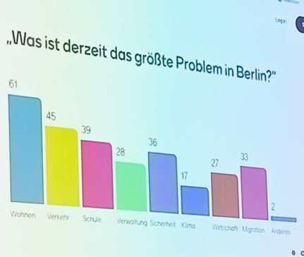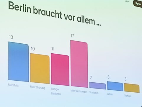 Im Publikum gab es die Antwort „ Berlin braucht vor allem…“: mehr Wohnungen, mehr Mut, weniger Bürokratie, mehr Ordnung….